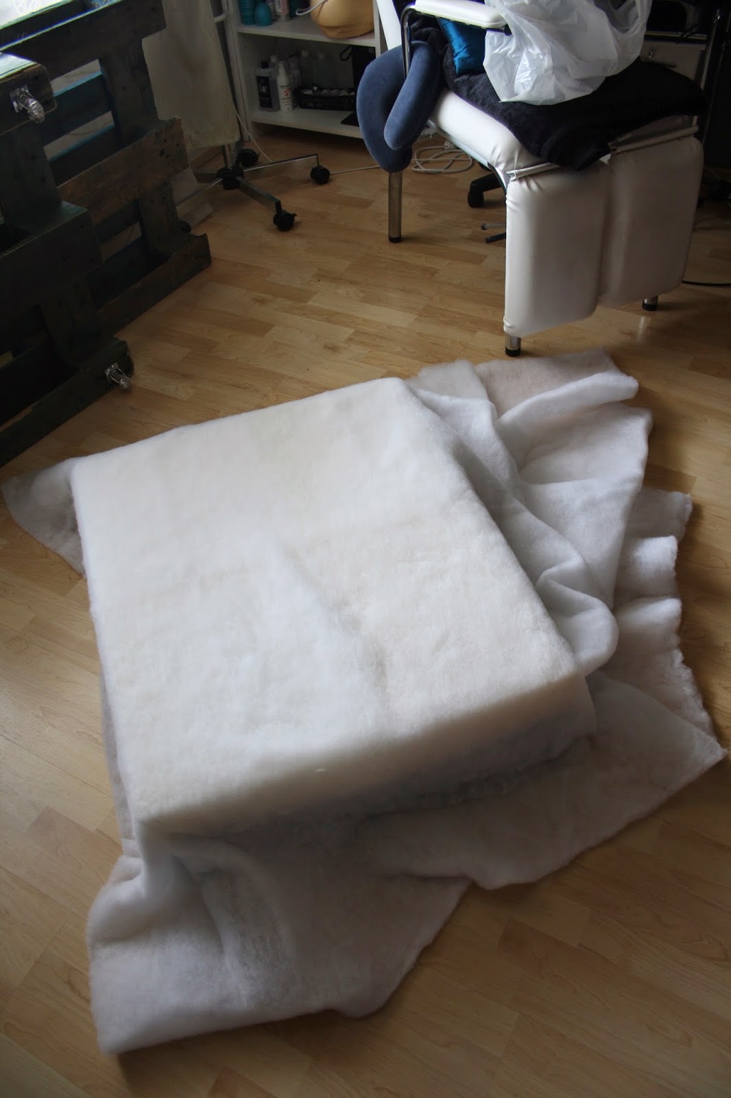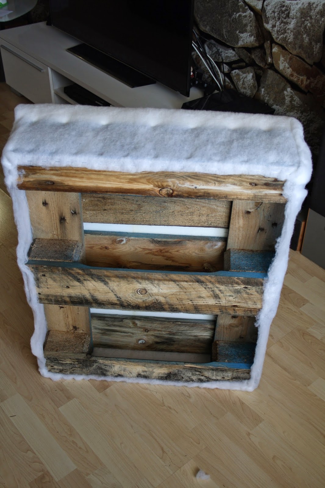 7) Laotasin vatiini porolooni peale nii et aluse äärte alla ka mahub, ja lõin klambripüstoliga kinni, ülevalt äärtest ja alt äärtest, nii et kindlalt kinni oleks. Nurkadest lõikasin üleliigse vatiini ära, sättisin ilusti ja lõin klambritega kinni.